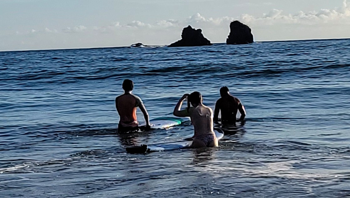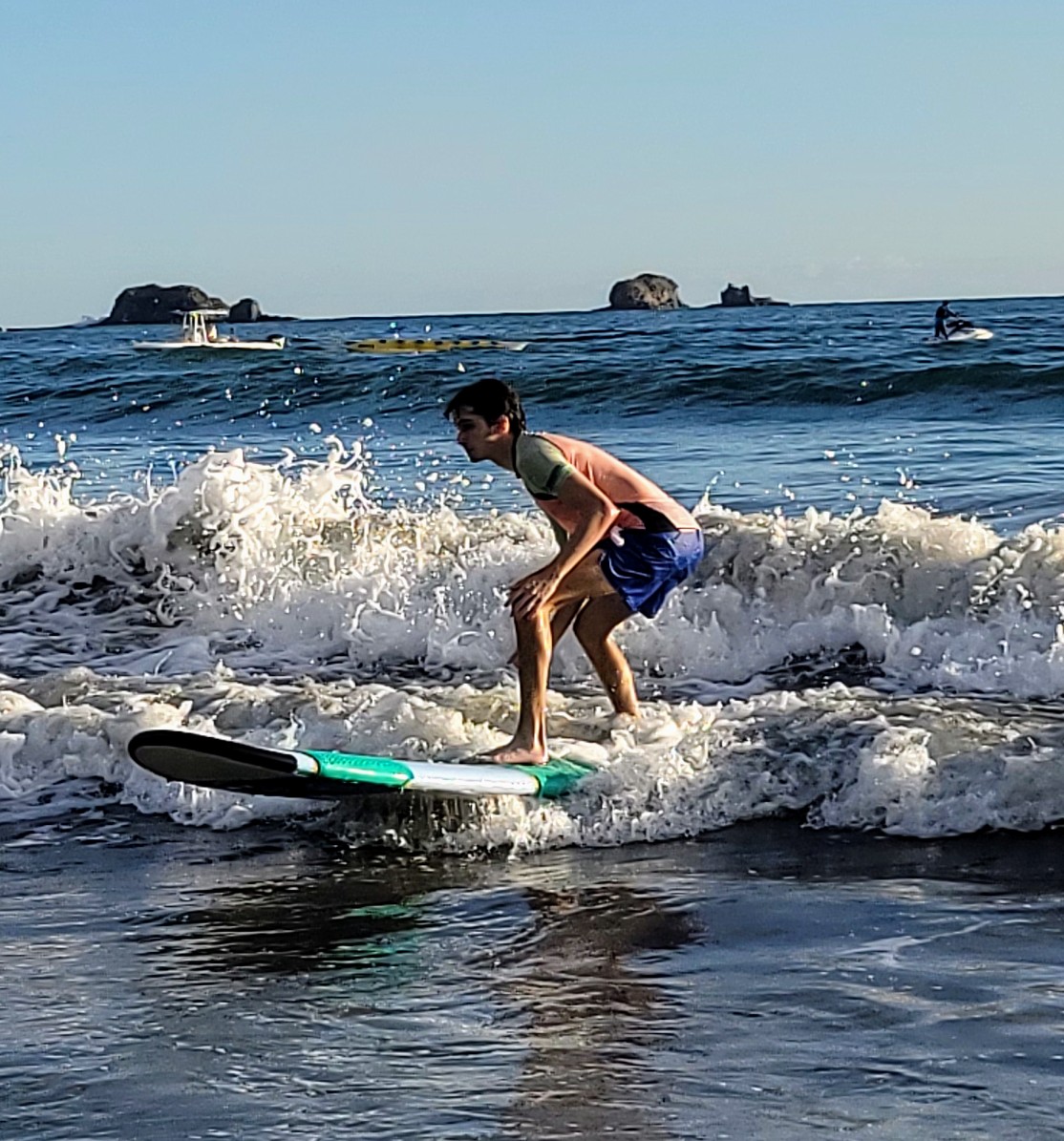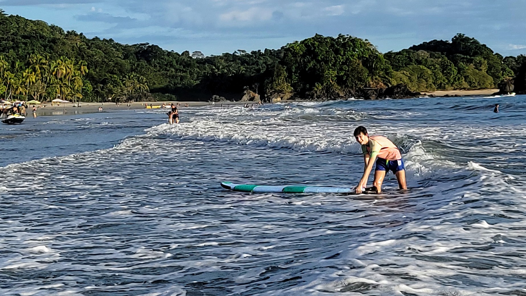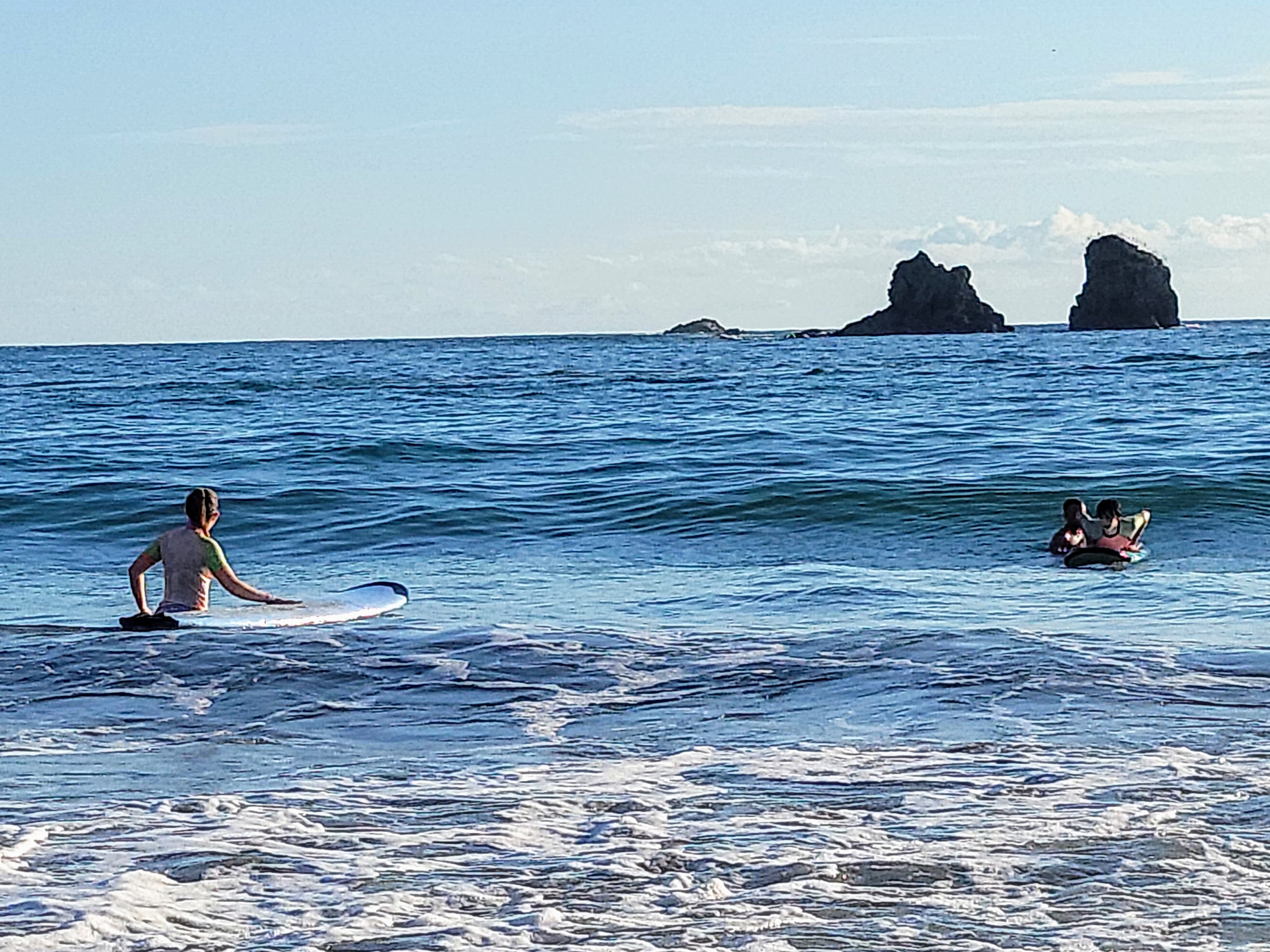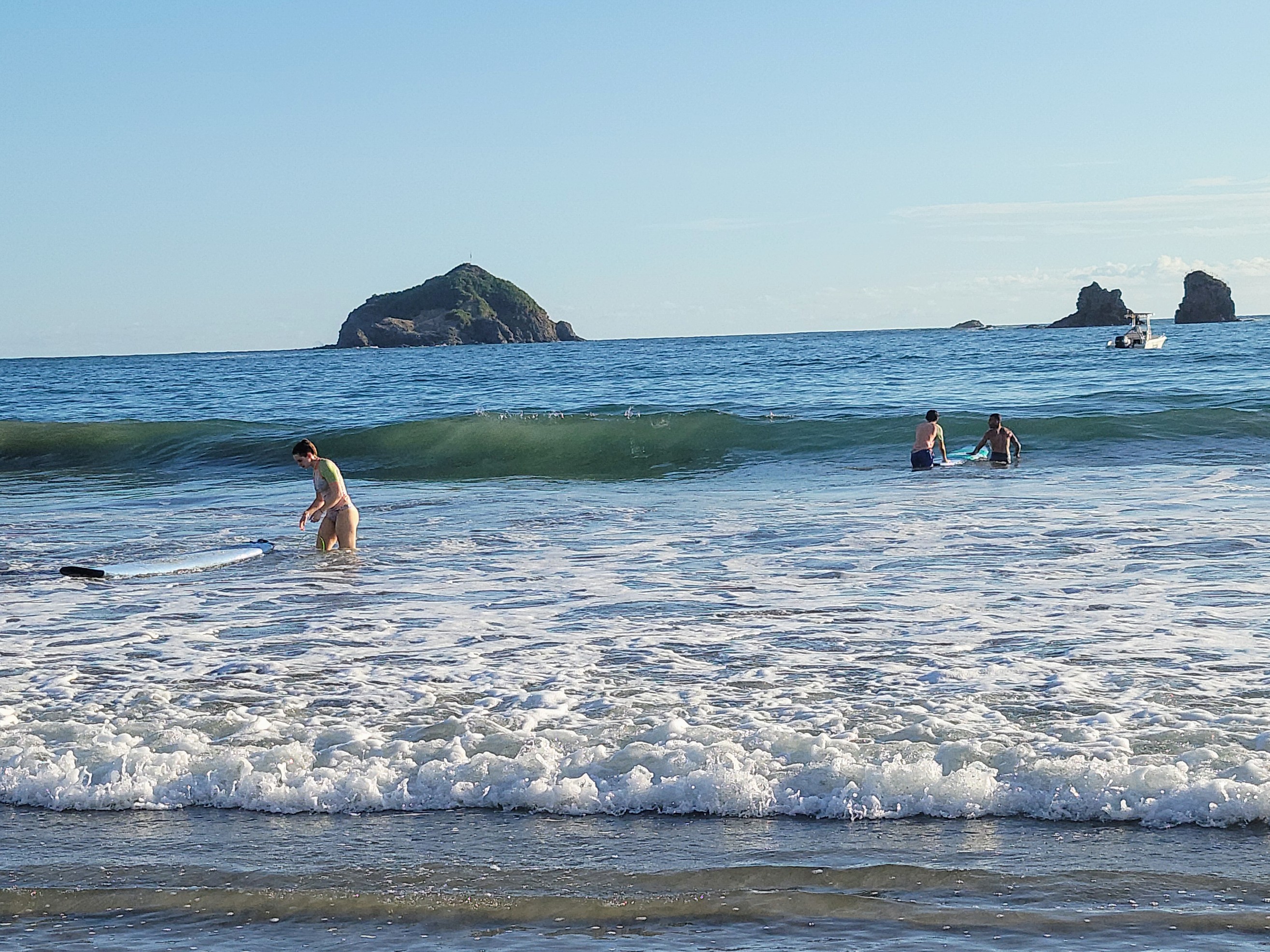 Today was our first day back at work and online school. We got finished early around 12:45pm (we’re 1 hour behind E.S.T.), took a nice long break (a.k.a..- siesta) then headed down to the beach around 2:30pm. Remi and Mason got their 1st surf lessons and were riding waves by the end. We also hung out around the beach with our new Costa Rican friends.