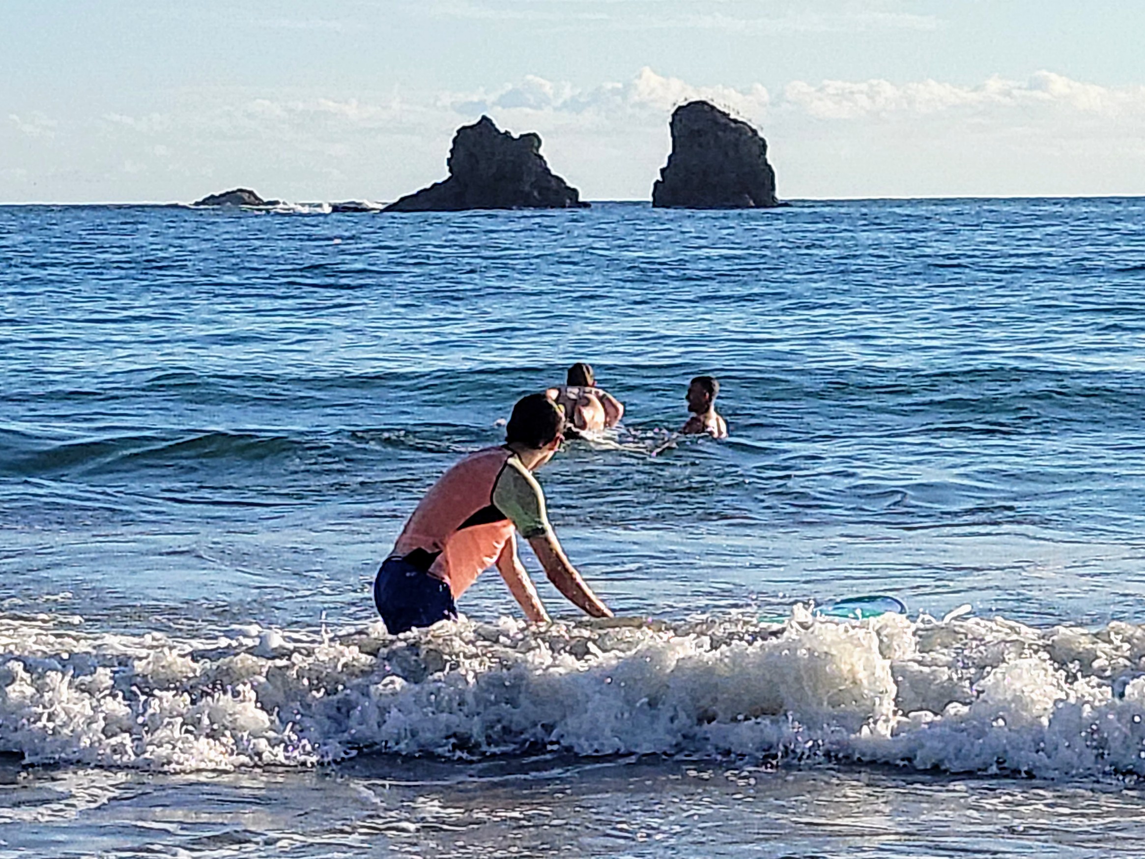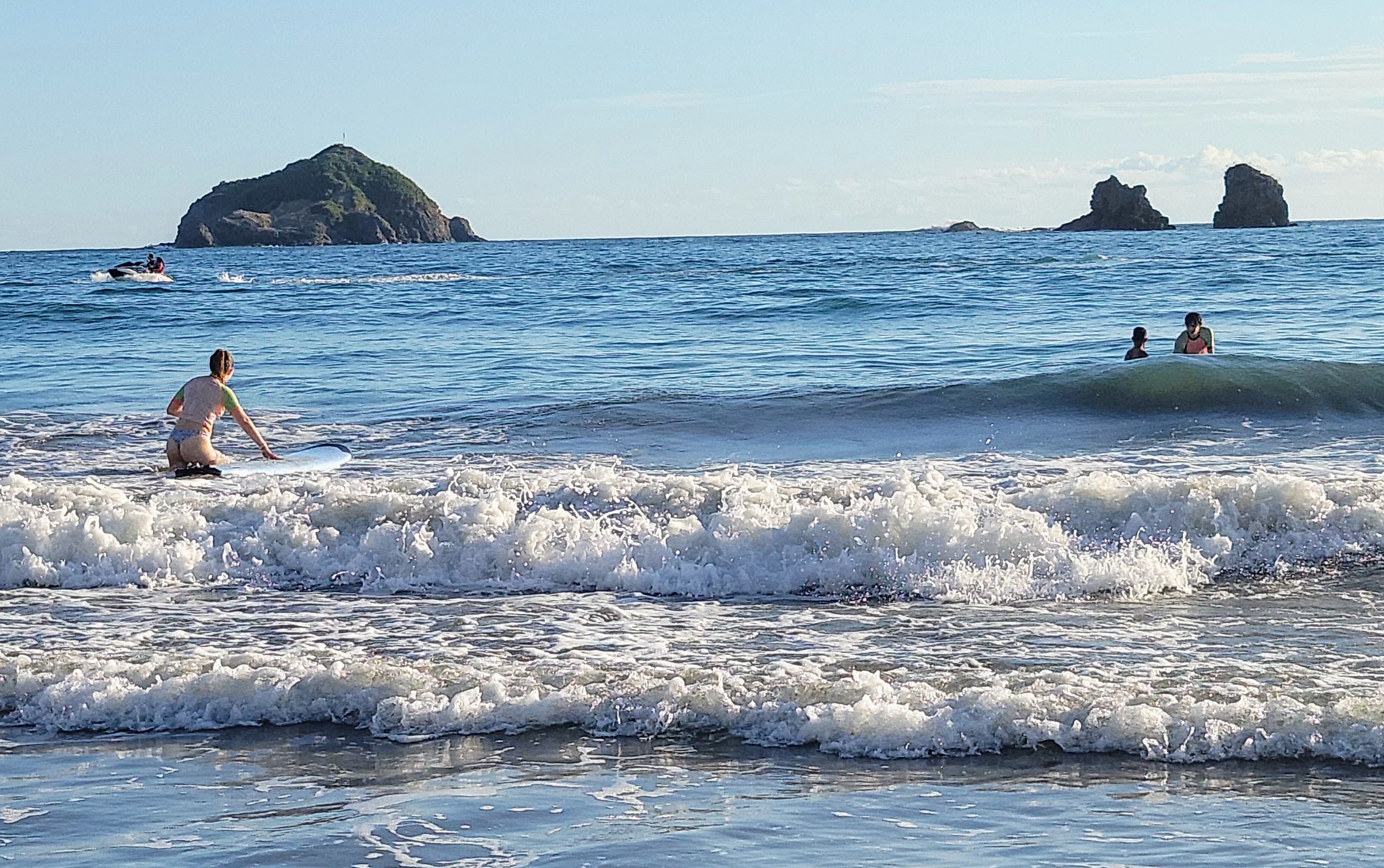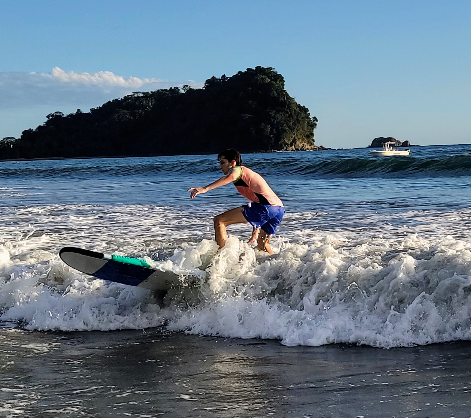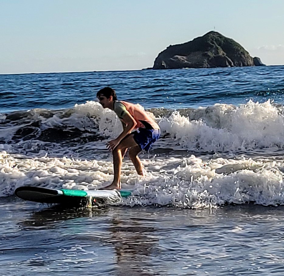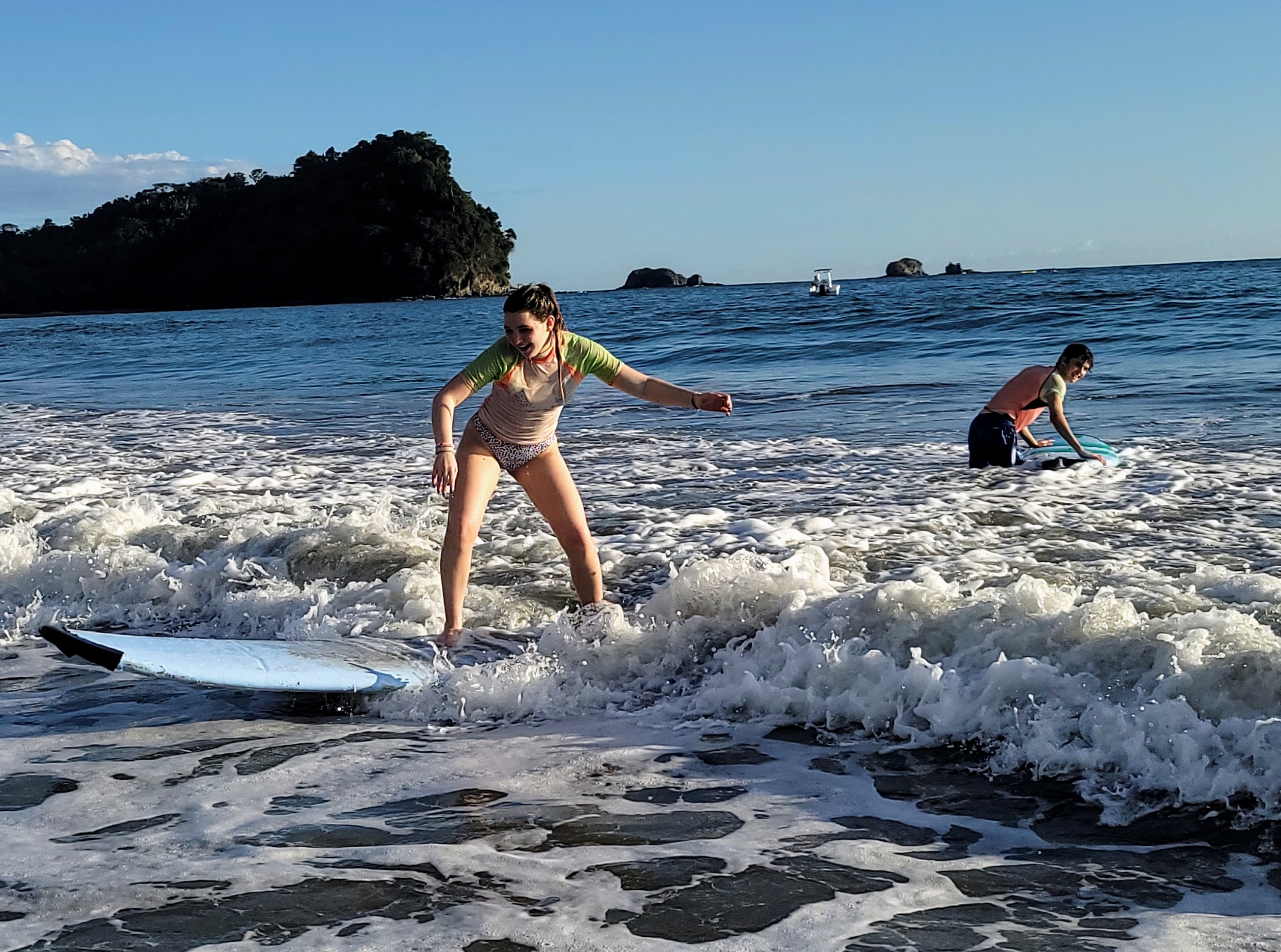 Today was our first day back at work and online school. We got finished early around 12:45pm (we’re 1 hour behind E.S.T.), took a nice long break (a.k.a..- siesta) then headed down to the beach around 2:30pm. Remi and Mason got their 1st surf lessons and were riding waves by the end. We also hung out around the beach with our new Costa Rican friends.