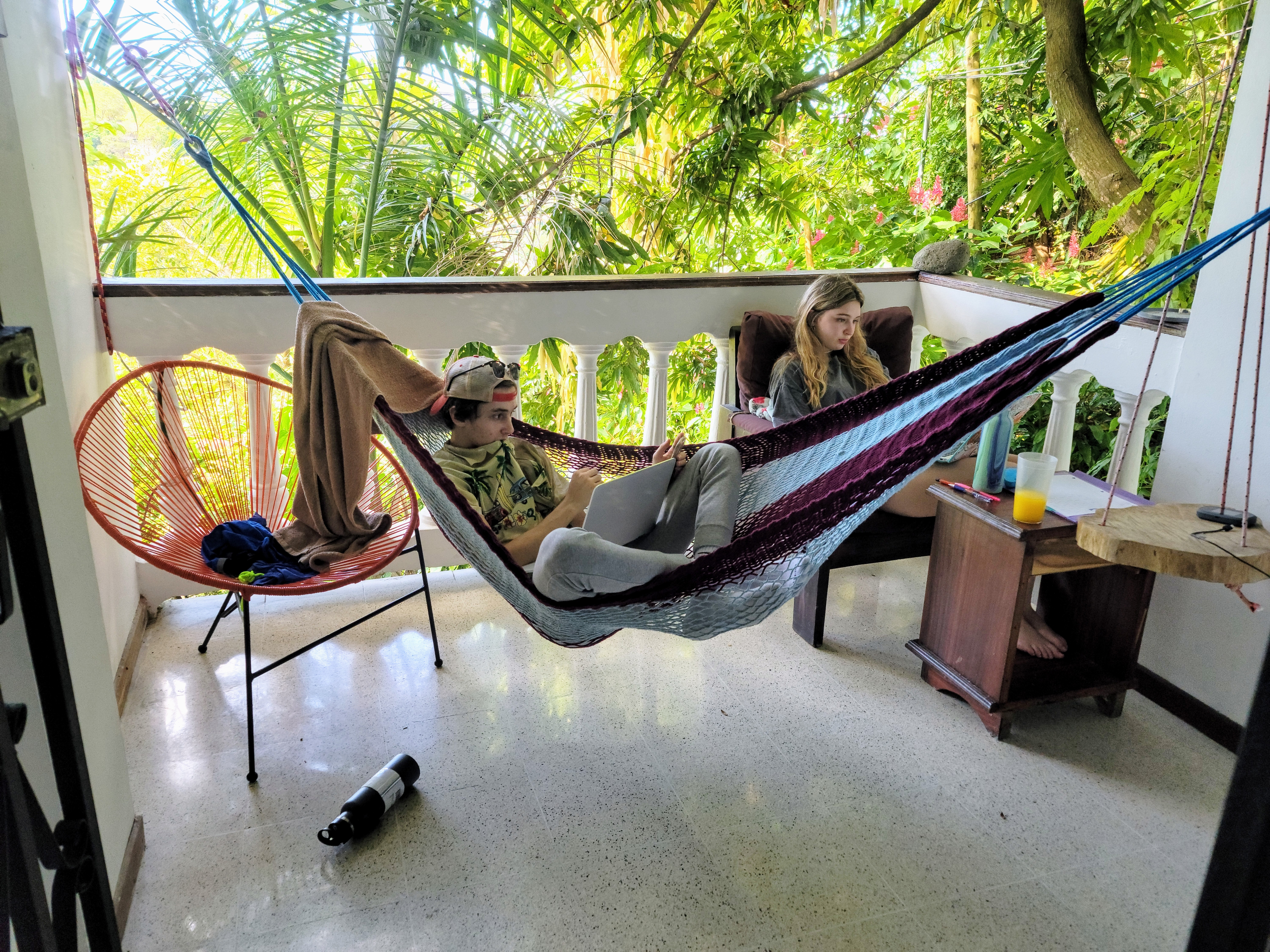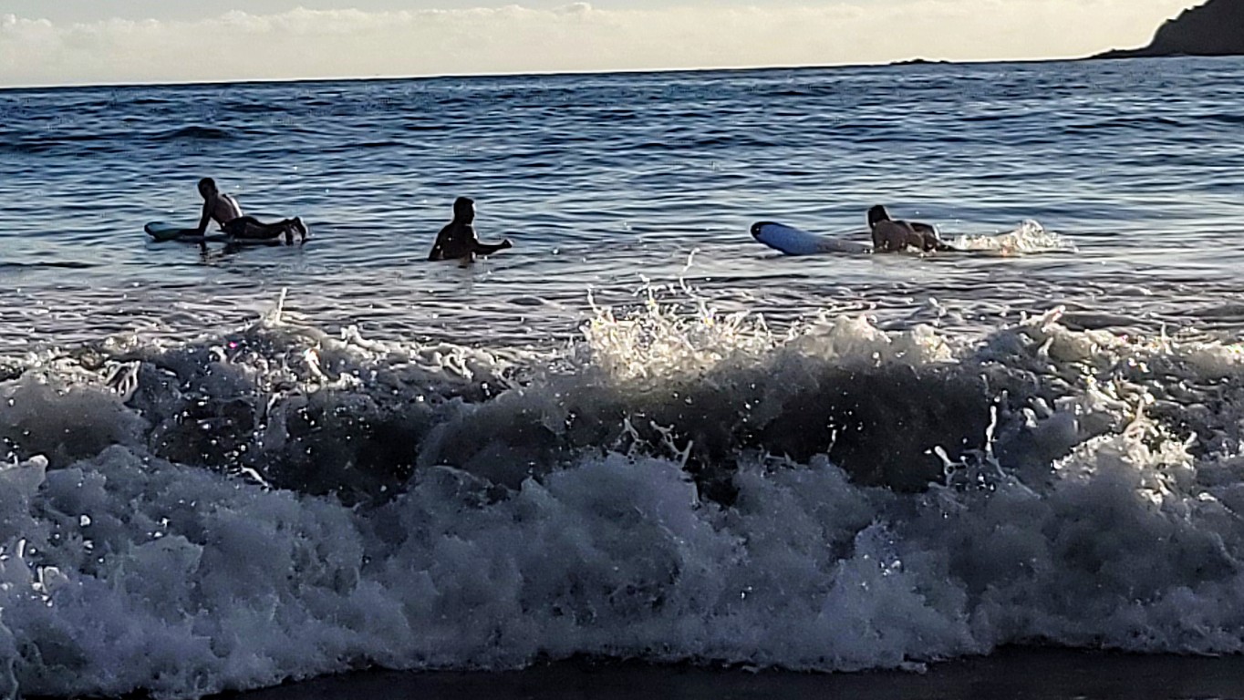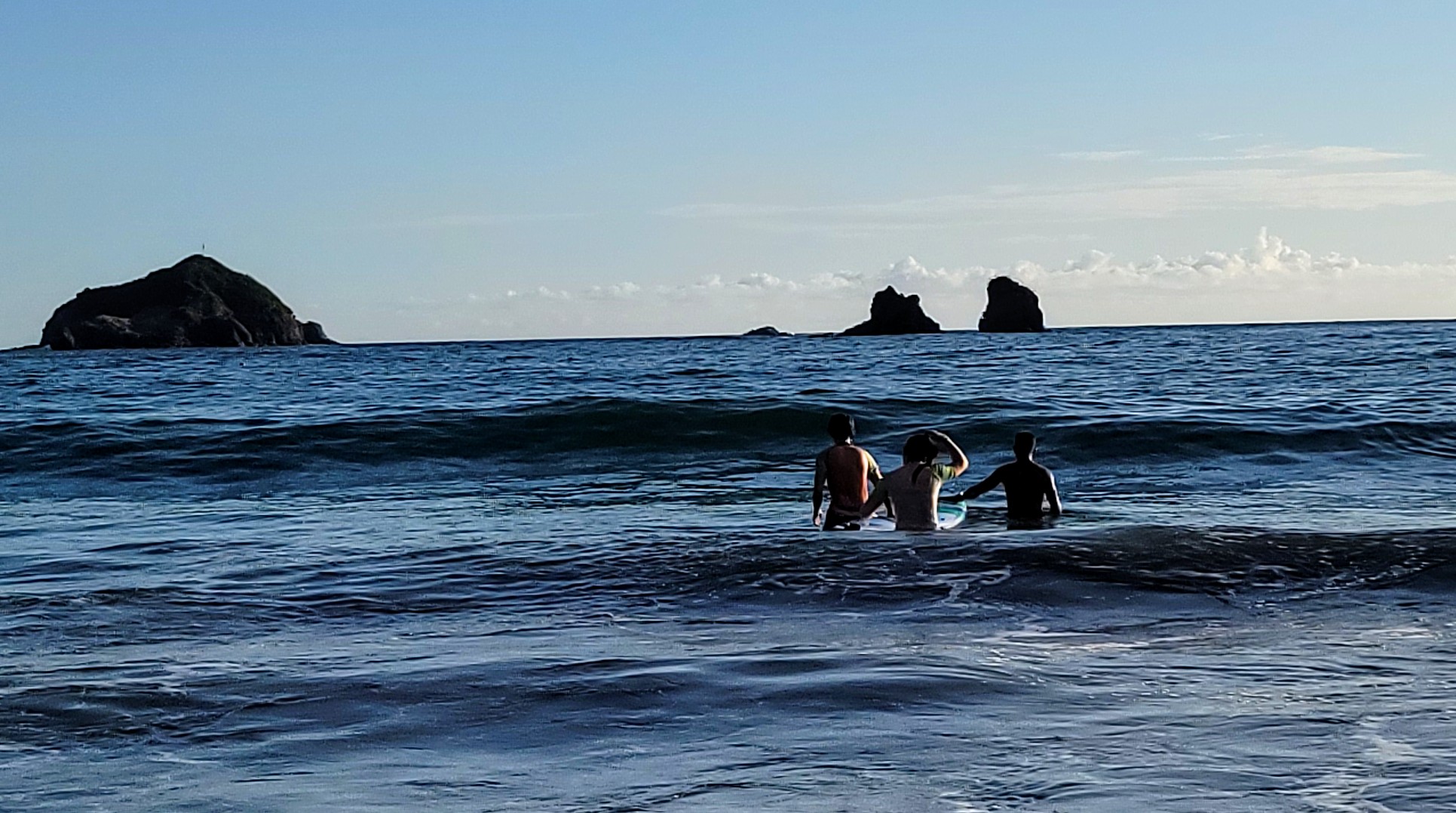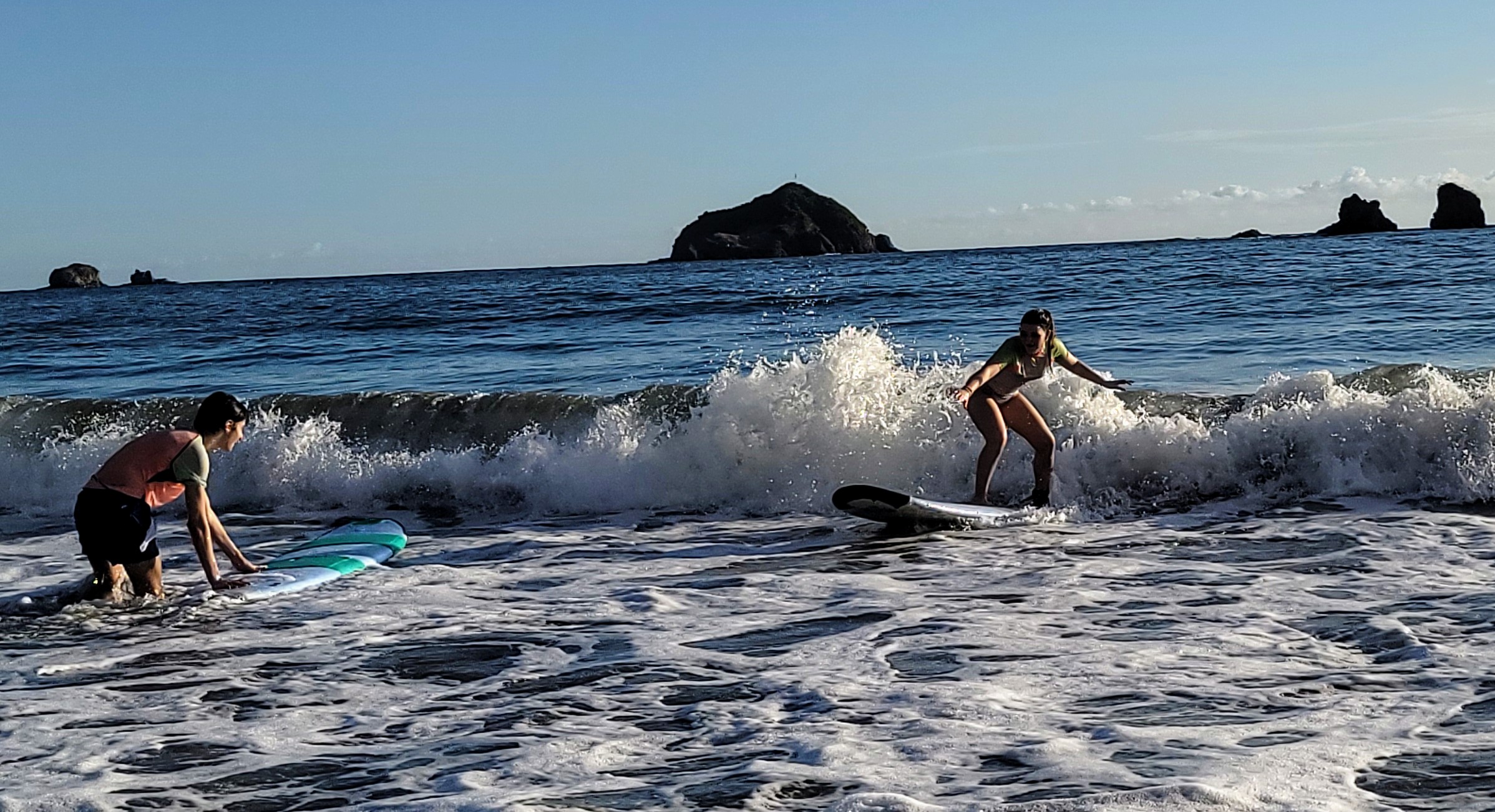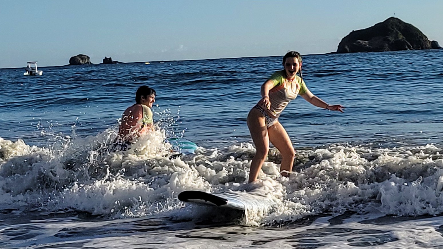 Today was our first day back at work and online school. We got finished early around 12:45pm (we’re 1 hour behind E.S.T.), took a nice long break (a.k.a..- siesta) then headed down to the beach around 2:30pm. Remi and Mason got their 1st surf lessons and were riding waves by the end. We also hung out around the beach with our new Costa Rican friends.
